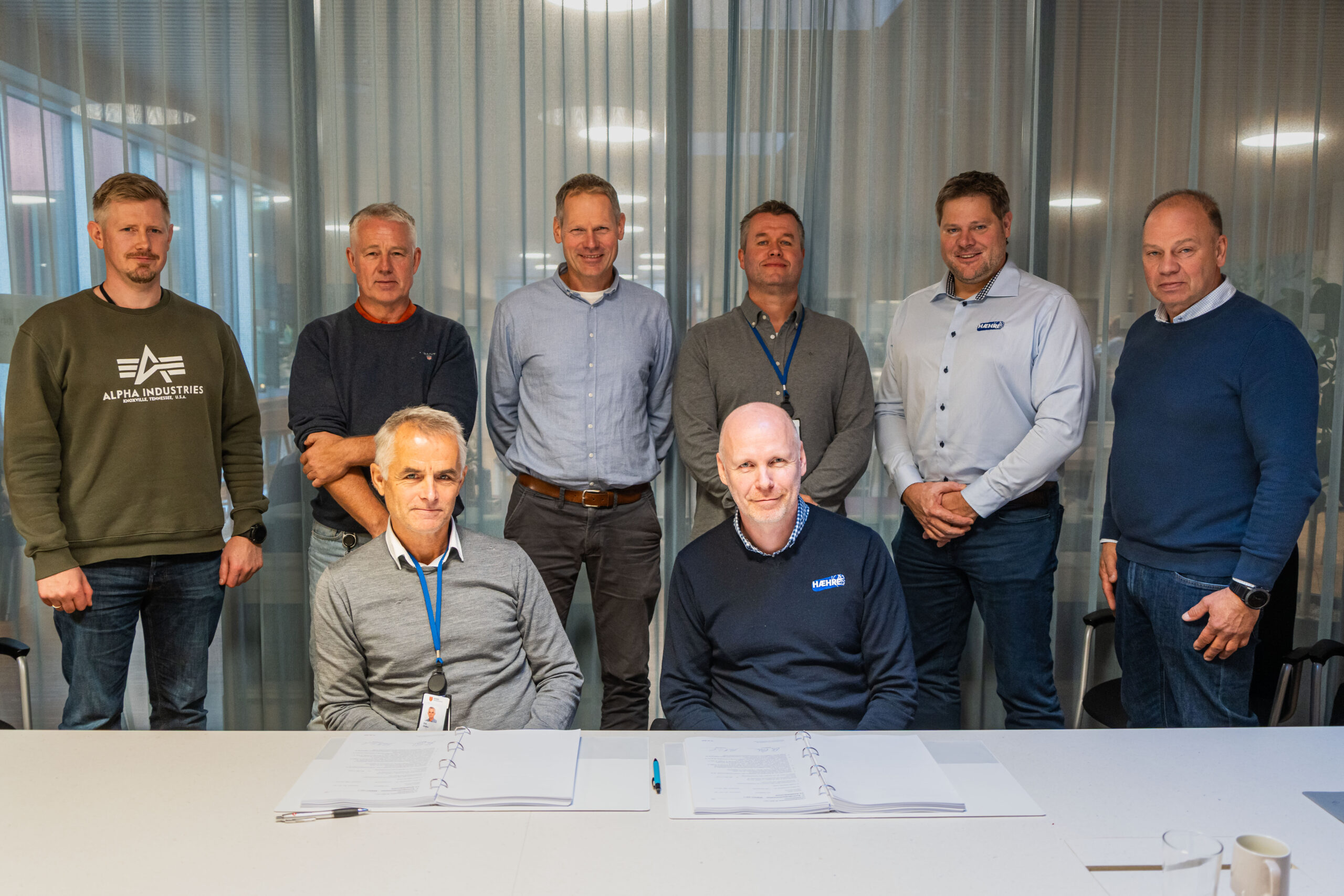 Kontraktsignering med Agder fylkeskommune og Hæhre. Bak fra venstre: Einar Linga Larsen, Steinar Jakobsen, Geir Norum, Ragnar Hellerslien, Ole Jakob Gjetrang (Hæhre) og Magne Tveiten. Fremme fra venstre: Ola Olsbu og Dan Robert Granerud (Hæhre). Agder fylkeskommune
